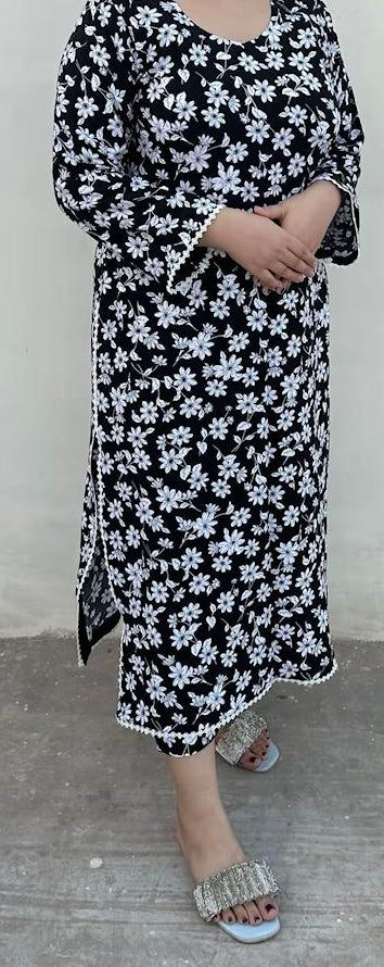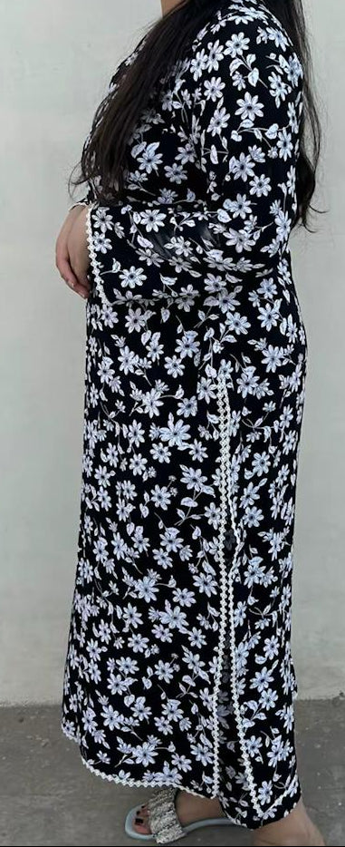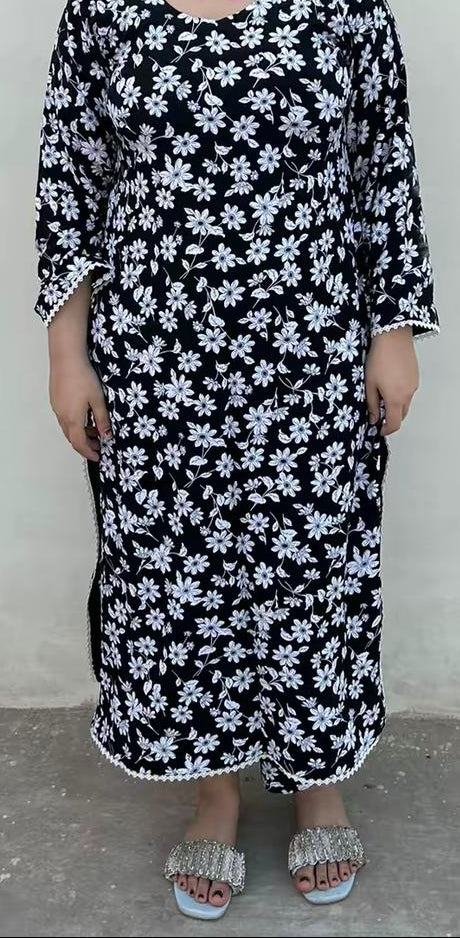 .The entire outfit has a black background that beautifully highlights the white floral print,